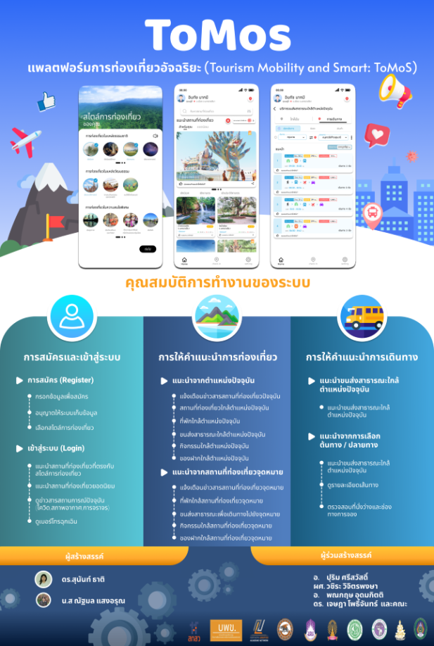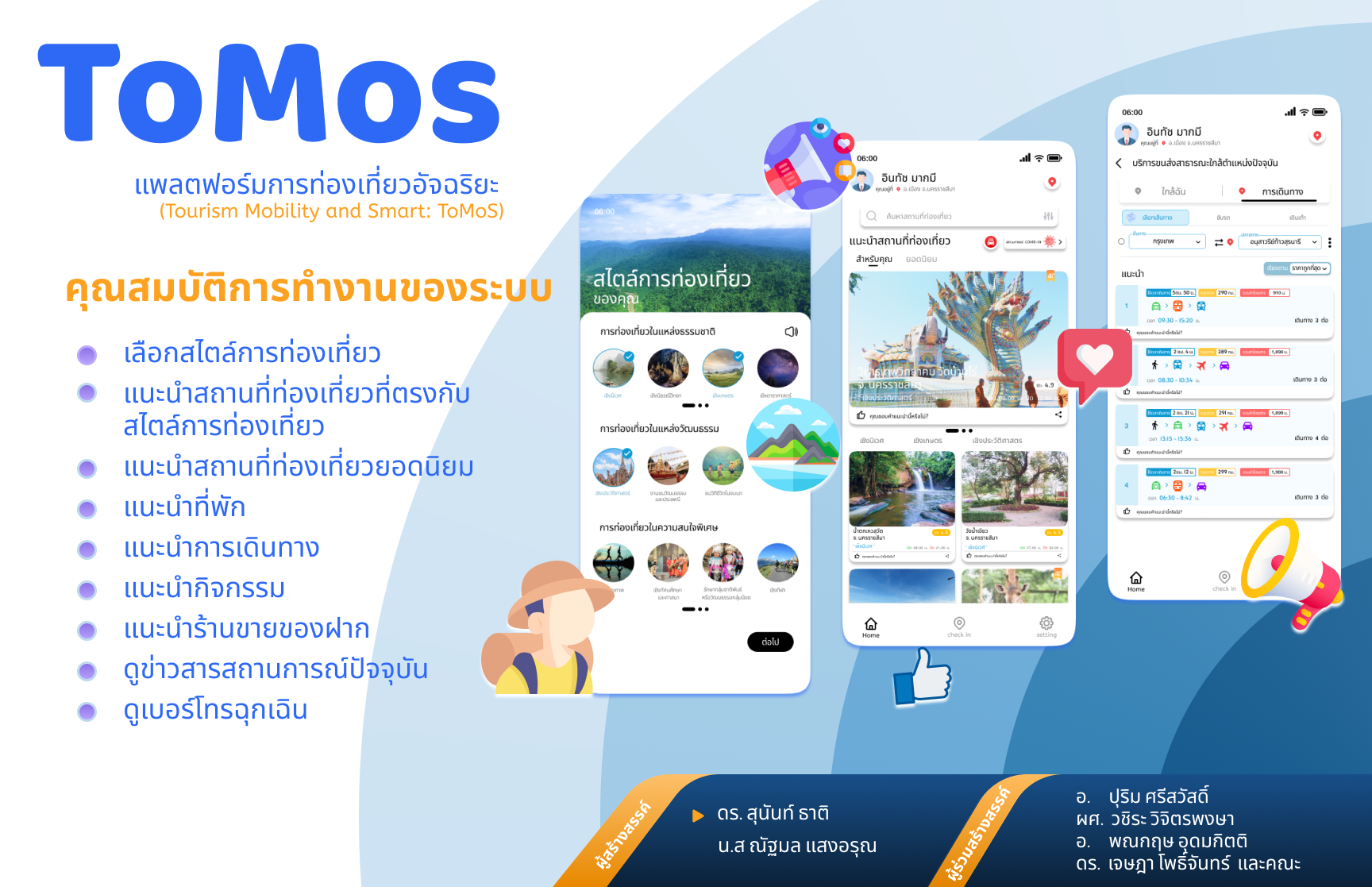 แผนงานวิจัยนี้มีวัตถุประสงค์เพื่อศึกษาความต้องการพัฒนาและรูปแบบการพัฒนาระบบขนส่งและการเดินทางอัจฉริยะเพื่อสนับสนุนการท่องเที่ยวไทย และ เพื่อนำมาจัดทำเป็นข้อเสนอแนะ และแผนปฏิบัติการในการยกระดับระบบขนส่งและการเดินทางอัจฉริยะเพื่อสนับสนุนการท่องเที่ยวไทย โดยผลการศึกษาส่วนหนึ่ง พบว่า ปัจจุบันนักท่องเที่ยวโดยเฉพาะนักท่องเที่ยวชาวต่างชาติมีการเดินทางจากจุดศูนย์กลาง (กรุงเทพมหานคร) สู่จังหวัดต่างๆ ในระดับภูมิภาค ด้วยรูปแบบการเดินทางได้อย่างหลากหลาย ประกอบด้วย ทางบก (รถยนต์ และ รถโดยสาร) ทางราง (รถไฟ) และ ทางอากาศ (เครื่องบิน) แต่จากผลการประเมินประสิทธิภาพของระบบขนส่งสาธารณะเพื่อการท่องเที่ยวในประเทศไทย พบว่า รูปแบบการเดินทางทั้งทางบก ทางราง และทางอากาศในปัจจุบัน ยังไม่สามารถเชื่อมต่อกันได้อย่างไร้รอยต่อ (Seamless) อีกทั้งยังไม่สามารถบูรณาการ (Integration) ทำงานร่วมกันได้อย่างมีประสิทธิภาพ ซึ่งทั้ง 2 ส่วนนี้ถือว่าเป็นองค์ประกอบสำคัญในการจะยกระดับระบบขนส่งและการเดินทางอัจฉริยะเพื่อสนับสนุนการท่องเที่ยวไทย ตามหลักการของ “ระบบการเดินทางอัจฉริยะ (Smart Mobility)” ที่มุ่งเน้นการเดินทางอย่างไร้รอยต่อที่มีการนำเทคโนโลยีมาใช้ให้เกิดการบูรณาการ บนพื้นฐานของความมีประสิทธิภาพ ยืดหยุ่น และเป็นมิตรต่อสิ่งแวดล้อม ดังนั้น คณะผู้วิจัยจึงมีแนวคิดในการพัฒนาแพลตฟอร์มการท่องเที่ยวอัจฉริยะ (ต้นแบบ) ภายใต้ชื่อ “ToMoS” ที่ย่อมาจาก “Tourism Mobility and Smart” เพื่อช่วยอำนวยความสะดวกในการเดินทางให้กับนักท่องเที่ยว โดยเป็นการนำเทคโนโลยีมาประยุกต์ใช้ให้เกิดการบรูณาการและการเชื่อมโยงอย่างไร้รอยต่อระหว่างรูปแบบการขนส่งและแหล่งท่องเที่ยวต่างๆ ซึ่งแพลตฟอร์มนี้จะช่วยให้นักท่องเที่ยวสามารถลดระยะเวลาในการรอคอยระหว่างจุดการเดินทางหรือสถานีต่างๆ และสามารถเดินทางไปยังแหล่งท่องเที่ยวต่างๆ ด้วยระบบขนส่งสาธารณะได้อย่างมีประสิทธิภาพ