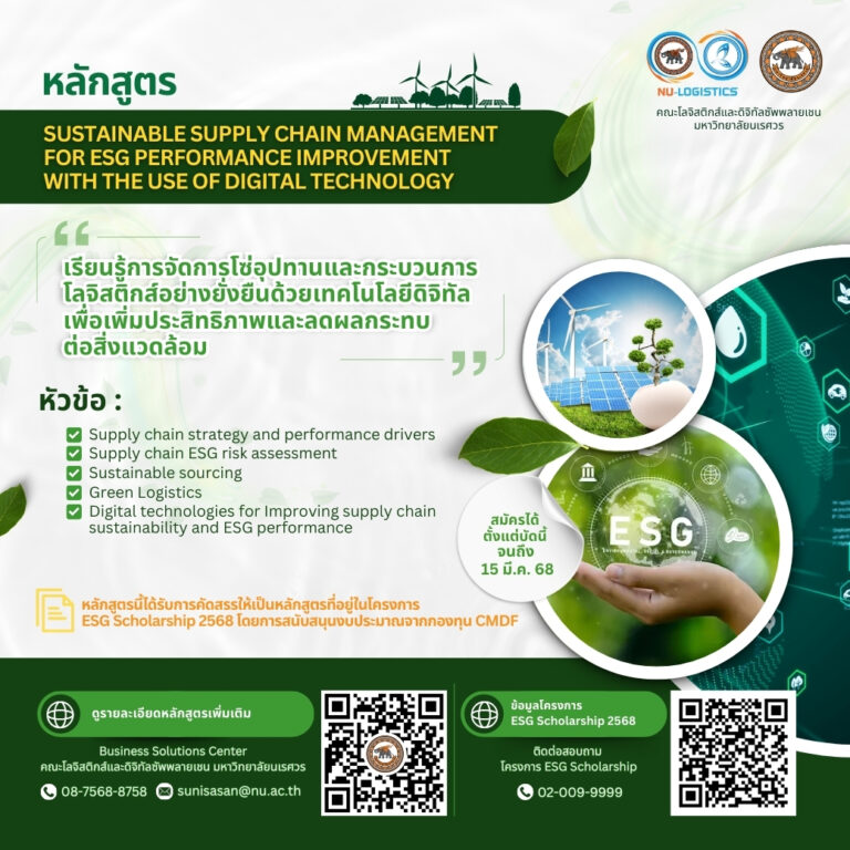หลักสูตรนี้มุ่งเน้นการบูรณาการแนวคิดความยั่งยืนเข้ากับการบริหารซัพพลายเชน พร้อมการใช้เทคโนโลยีสมัยใหม่เพื่อยกระดับประสิทธิภาพด้านความยั่งยืน เนื้อหาครอบคลุมกลยุทธ์และปัจจัยขับเคลื่อนซัพพลายเชน การประเมินสมรรถนะด้านความยั่งยืนและความเสี่ยงด้าน ESG การปฏิบัติด้านจริยธรรมในซัพพลายเชน การประยุกต์ใช้เทคโนโลยี เช่น หุ่นยนต์ ดิจิทัลทวิน และบล็อกเชน รวมถึงการวิเคราะห์ผลกระทบทางสังคมและสิ่งแวดล้อมของซัพพลายเชนขยาย และการเชื่อมโยงผลกระทบเหล่านี้กับผลการดำเนินงานทางเศรษฐกิจ